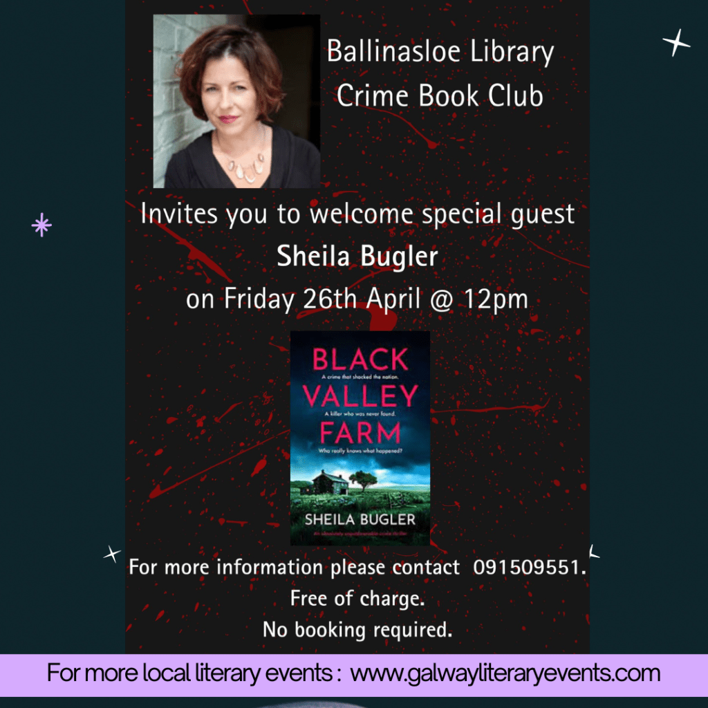 Ballinasloe Library Crime Book Club welcomes special guest, crime writer Sheila Bugler, the author of the novel Black Valley Farm published by Canelo. No booking is required for this free event. For more information please contact 091 509551.