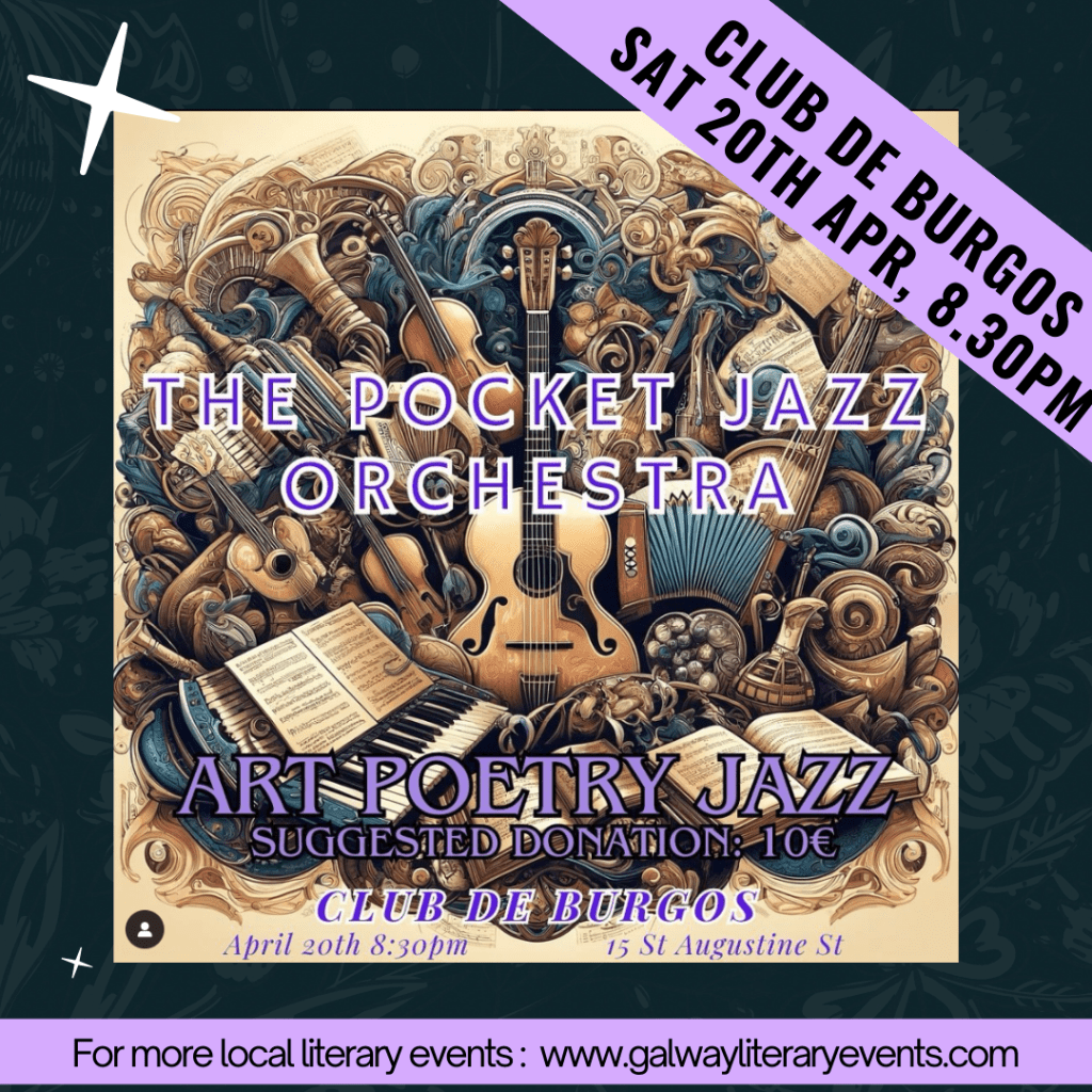 An evening of Art, Poetry and Jazz at Club De Burgos, Saint Augustine street with local poets and the Pocket Jazz Orchestra. A donation of €10 is suggested.